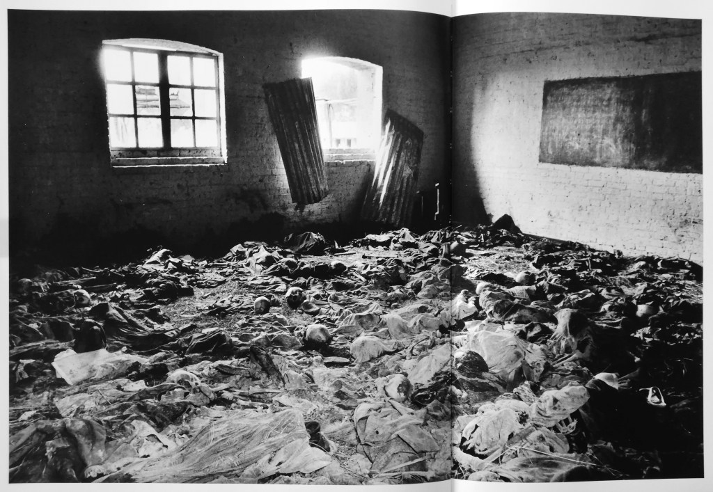 Esta fotografía fue tomada en una escuela abandonada en una aldea de Nyarubuye, a pocos kilómetros de la frontera tanzana. Miles de tutsis fueron brutalmente asesinados aquí en abril de 1994. Nadie enterró sus cuerpos, ya que los supervivientes habían huido. La mayoría de los cadáveres fueron salvajemente mutilados, y los miembros humanos esparcidos por una sala que había servido de escuela. Después de las masacres, y por miedo a la venganza, los hutus huyeron al campo de refugiados de Benako, del otro lado de la frontera de Tanzania. Ahora sólo quedan soldados tutsis que esperan una contraofensiva desde Tanzania. Ruanda. 1995″.