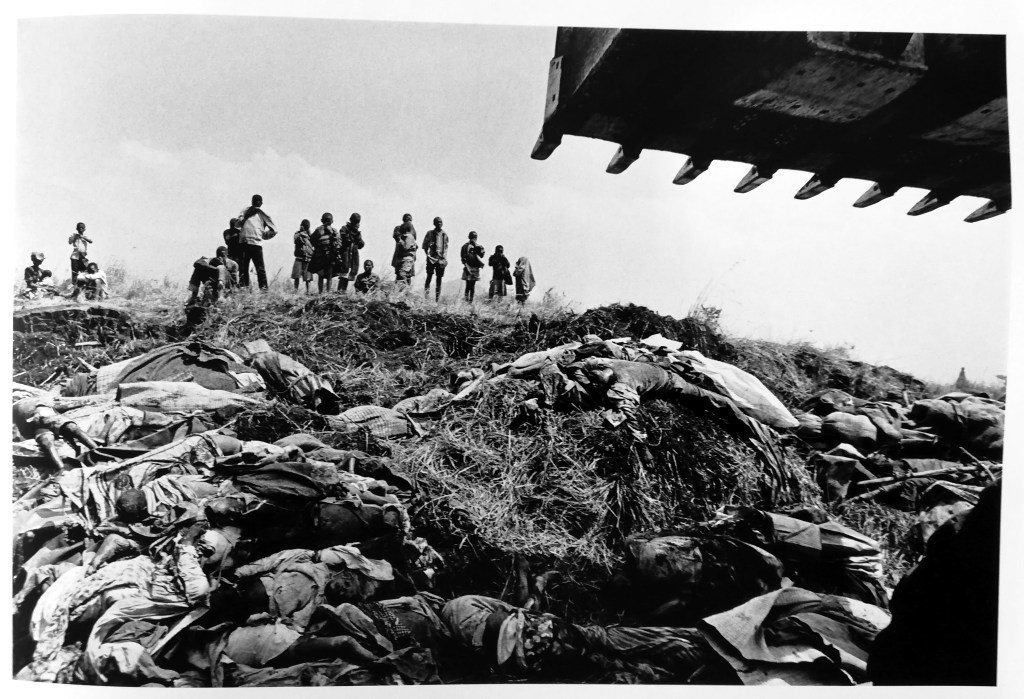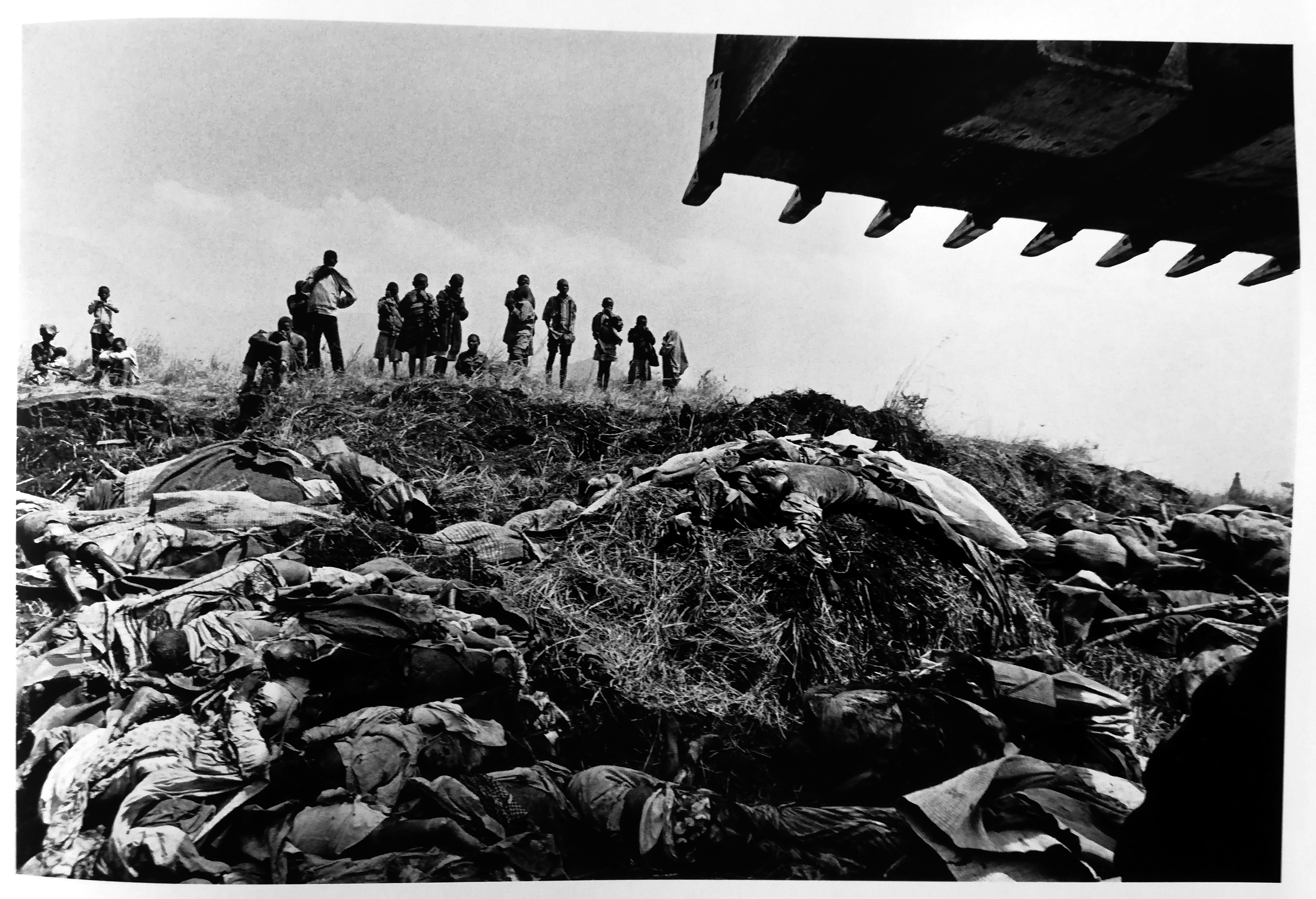 192 y 193 En el campo de Kibumba, miles de refugiados ruandeses mueren a diario por culpa del cólera, la disentería, el hambre y la desesperación, víctimas de una de las tragedias más horribles de la historia reciente. Estas fotografías muestran los funerales de más de 4.000 personas, demasiadas para que puedan celebrar honras fúnebres. Los tractores del ejército francés apilan los cuerpos sobre montones de lava volcánica y después los cubren con tierra. La muerte se ha convertido en un problema logístico. Zaire. 1994.